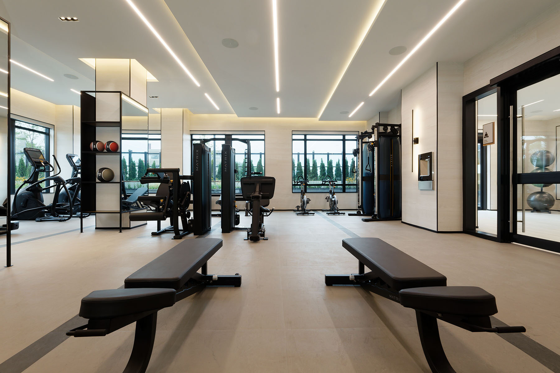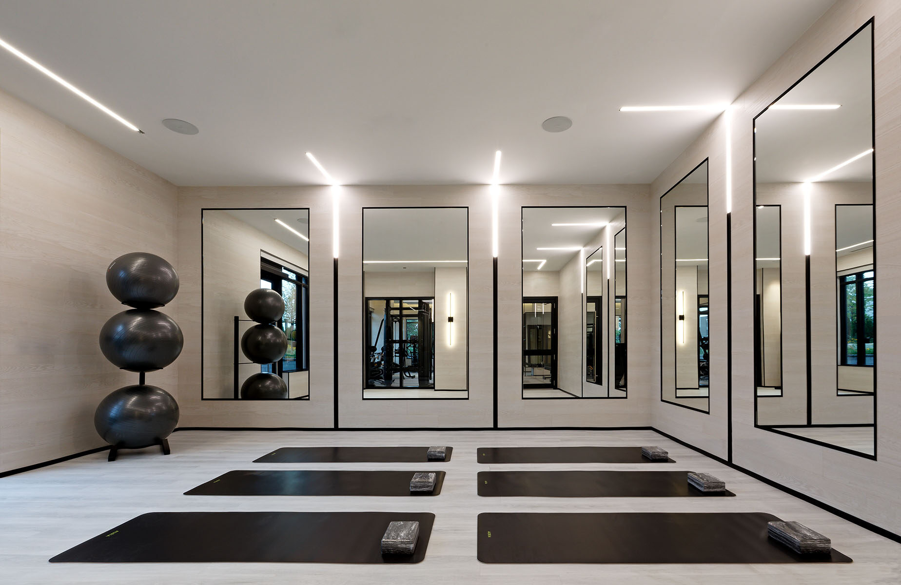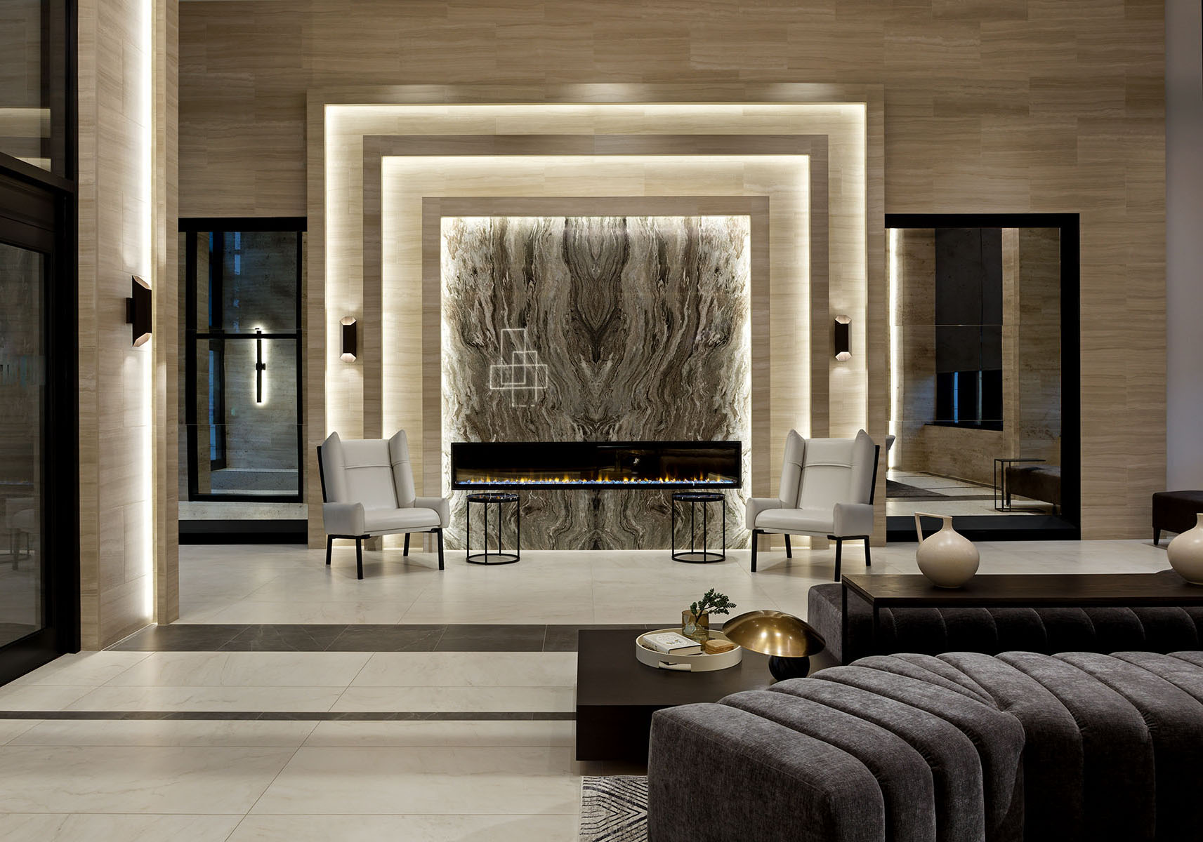 Large interior spaces allowed us to allow the rooms to speak with warm tones. The soaring ceiling of the lobby provides ample seating space for residents waiting for visitors, while the stepped light strips provide a subtle illumination to the concerge desk.